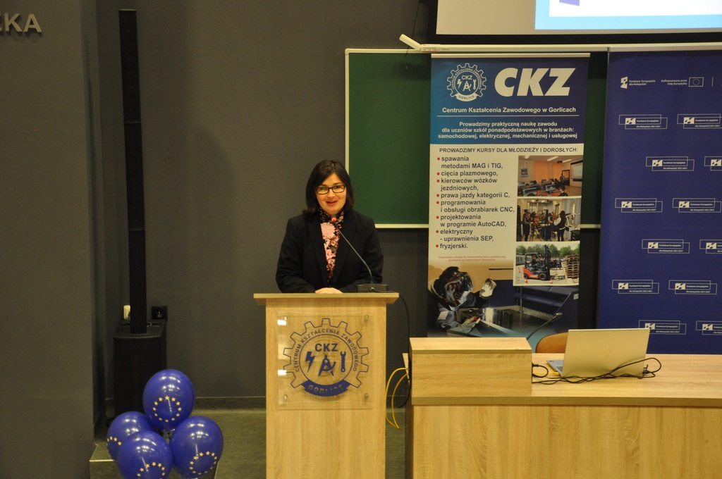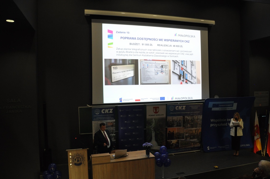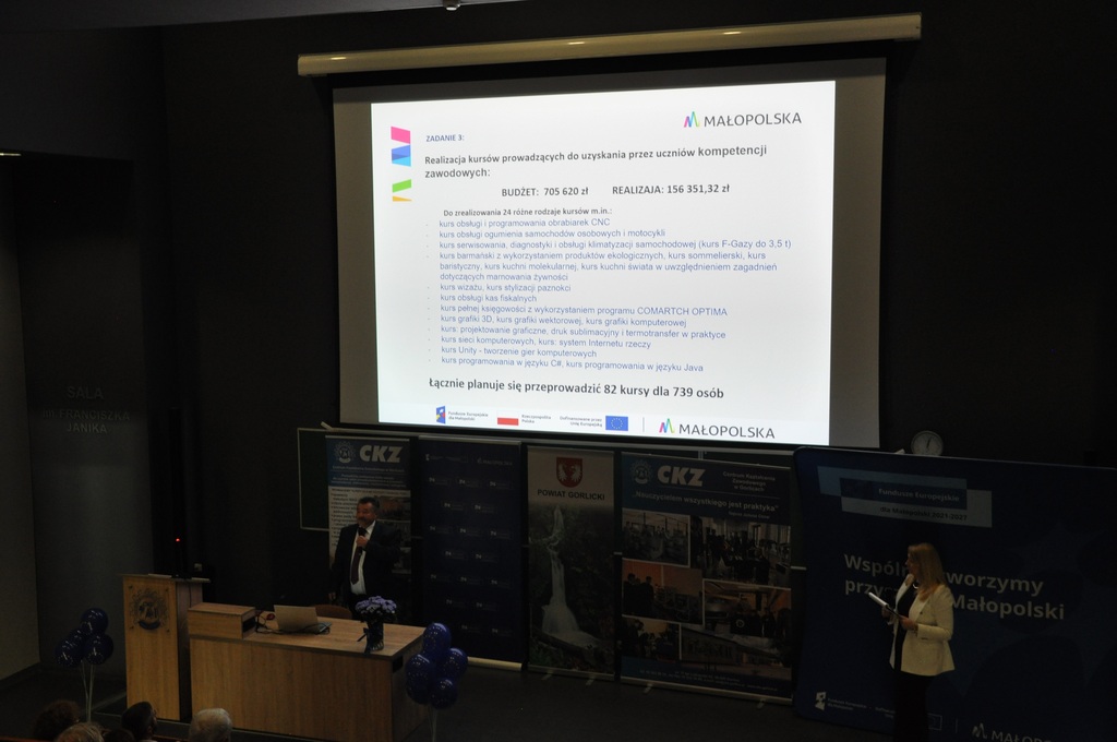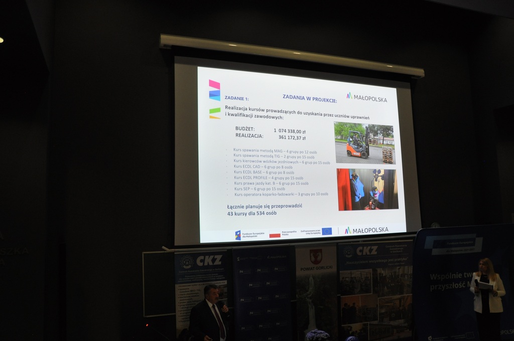 Pan Adam Tarsa – Dyrektor Centrum Kształcenia Zawodowego w Gorlicach oraz Pani Beata Szary – Koordynator Projektu, zaprezentowali rezultaty związane z realizacją projektu w kilku obszarach: