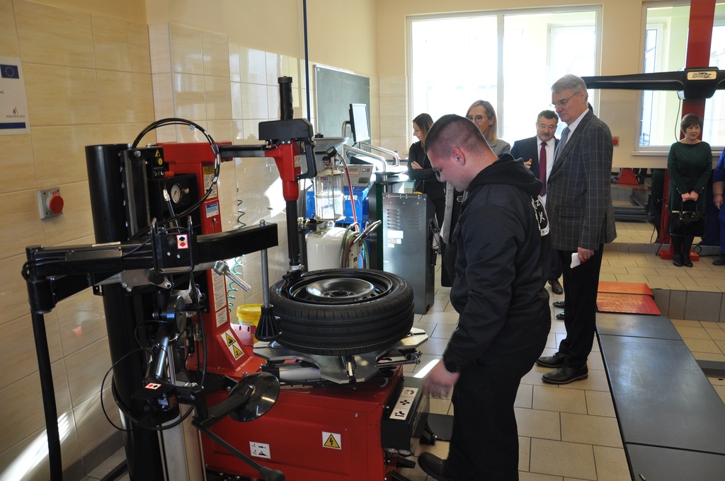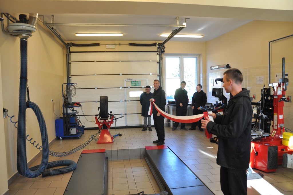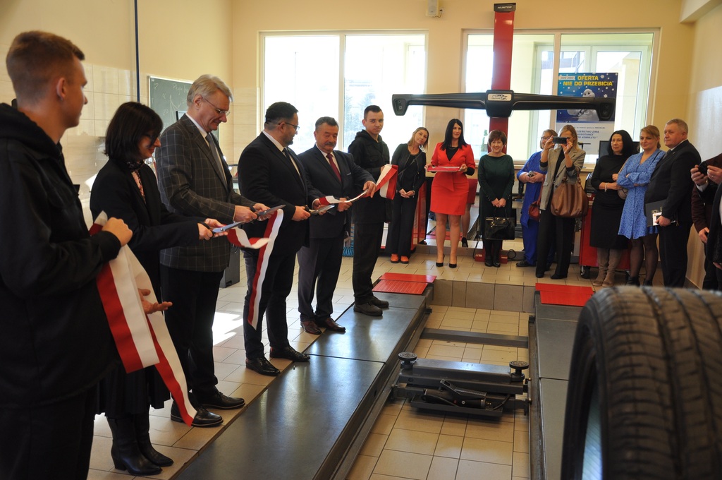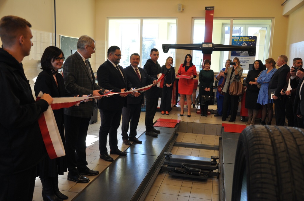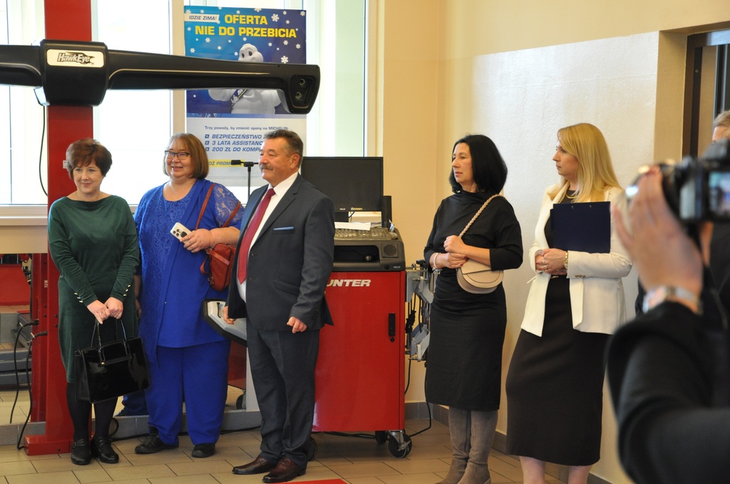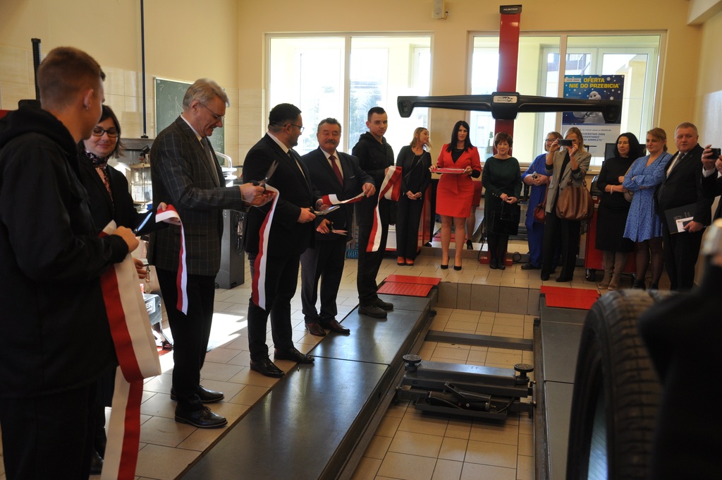 Kluczowym punktem spotkania było uroczyste przekazanie zakupionego w ramach projektu wyposażenia i pomocy dydaktycznych do pracowni samochodowej w Centrum Kształcenia Zawodowego w Gorlicach. Symbolicznego przecięcia wstęgi dokonali: Pan Mirosław Waląg, Pani Agata Suszczyńska, Pan Tomasz Płatek oraz Pan Adam Tarsa.